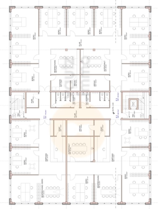 Die moderne Bürofläche in einem großen Bürokomplex ist ausgestattet wie folgt: